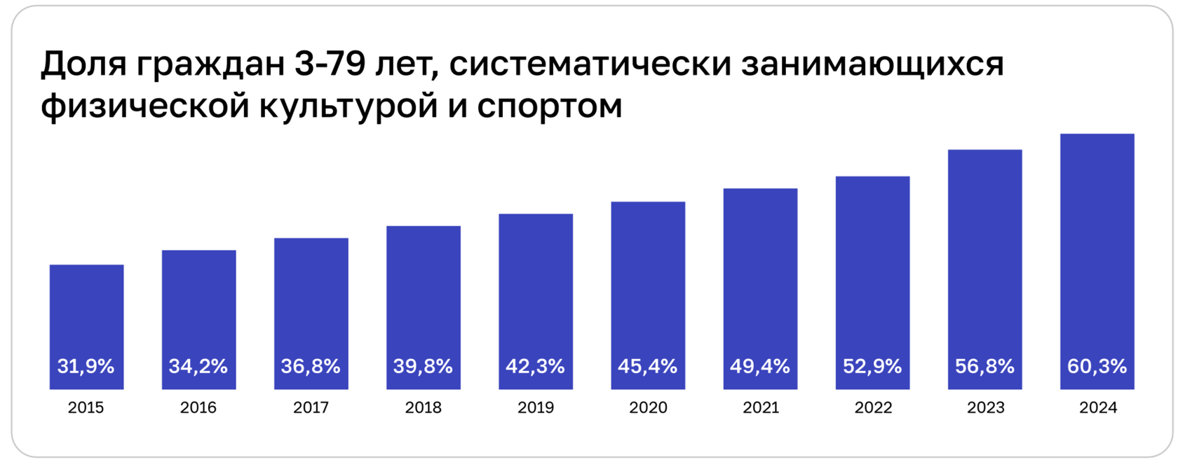 А для общей картины напомню, что в "Стратегии-2030" KPI ключевой цифры (% населения, вовлеченного в спорт) стоит на уровне 70%. Находясь на уровне 60,3% по сравнению с 2023-м доля занимающихся выросла на 3,5% и уверенно шагает вверх.